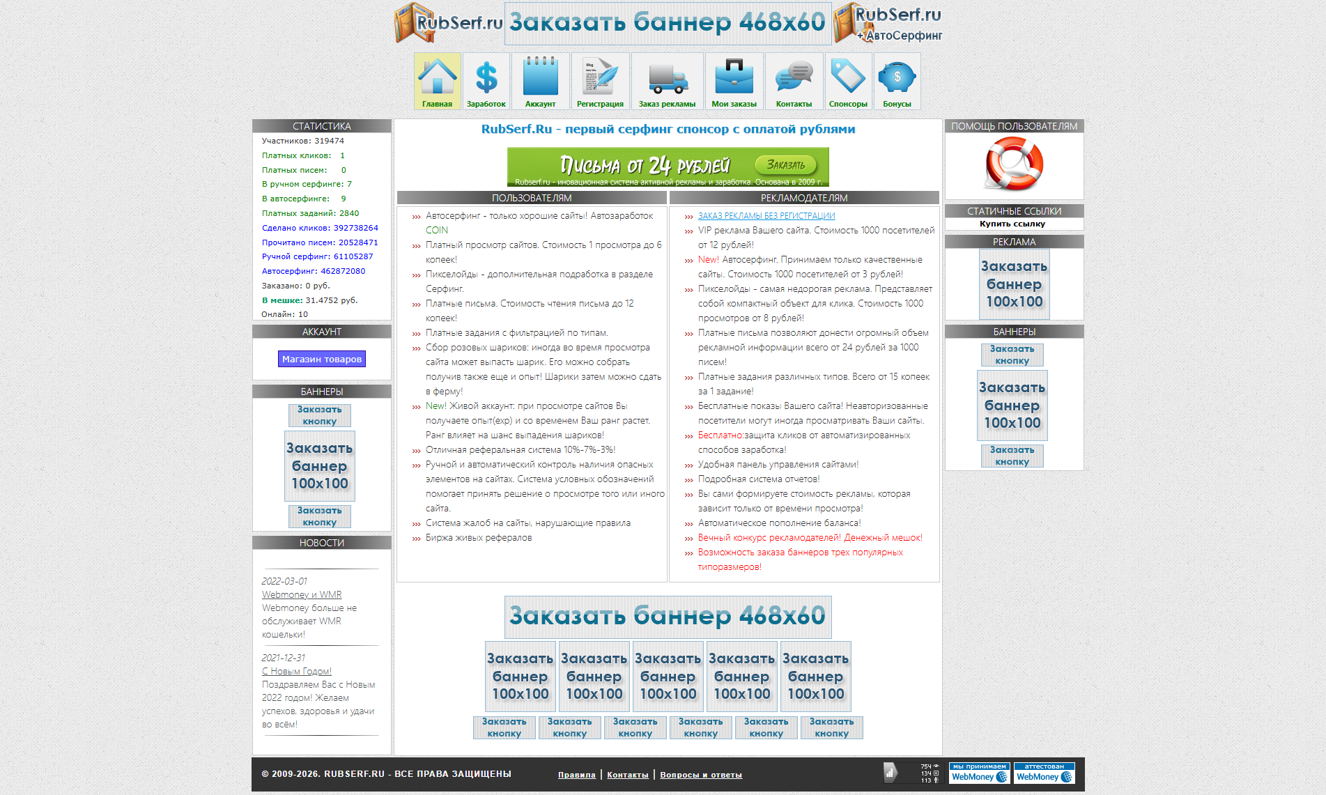 Сайт Rubserf вполне можно считать почтовым спонсором, по мимо заработка программой (который мы рассмотрим) есть возможность дополнительного заработка в разделах; клики по ссылкам, чтение писем, ручной серфинг, программой Rubserf, выполнение не сложных заданий, собирать бонусы.