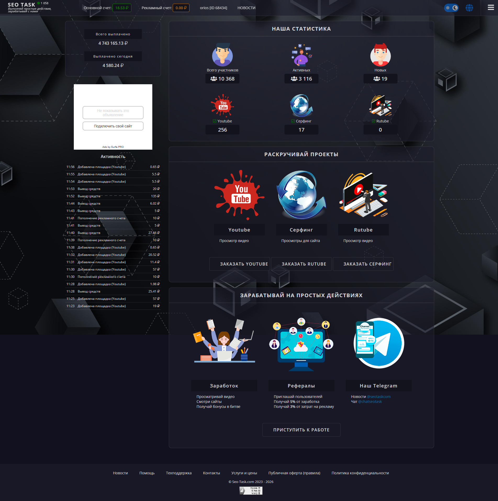 Очень интересный сайт, кроме традиционных кликов, просмотра видео и Offers здесь есть колесо фортуны, командная игра и конкурс «работник дня».